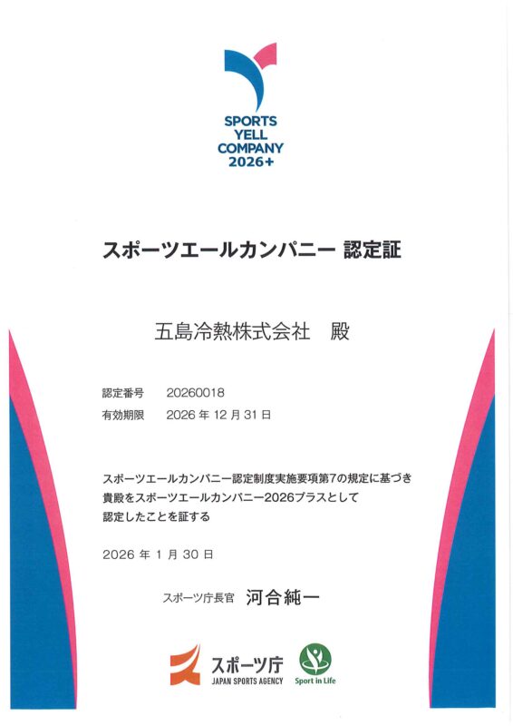 スポーツエールカンパニー2026プラス 認定されました 2026/02/19 Thu ・ 投稿者 : 五島 秀 ・ カテゴリー : トピックス 2年連続での「プラス」認定となりました。 前の記事へ トピックス